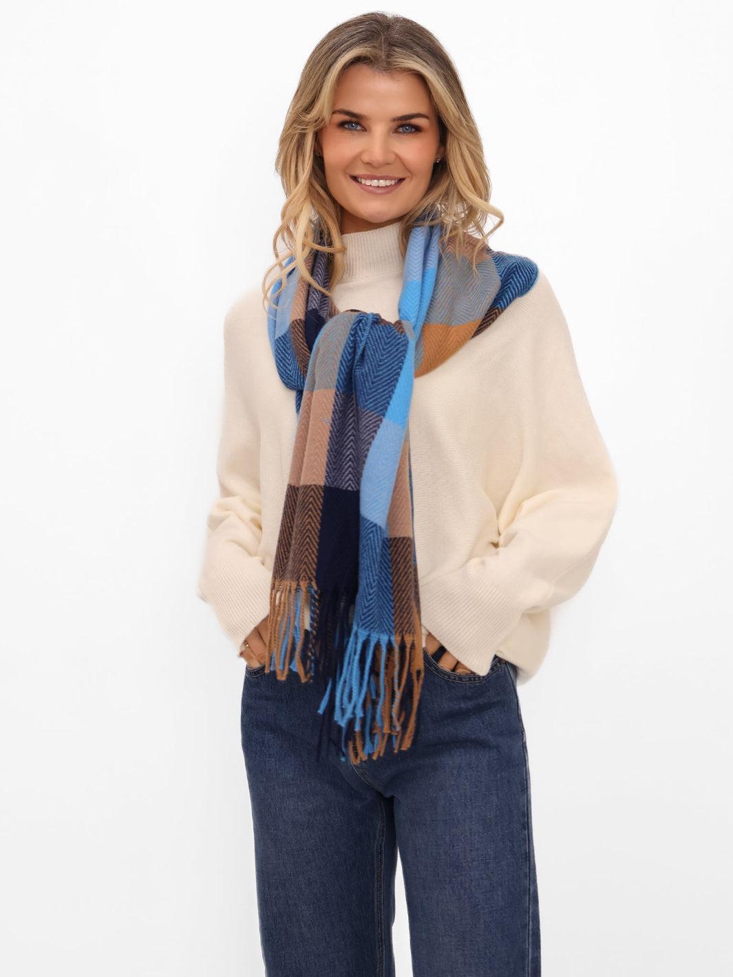 Luxe soft-touch scarf in blue & caramel tones